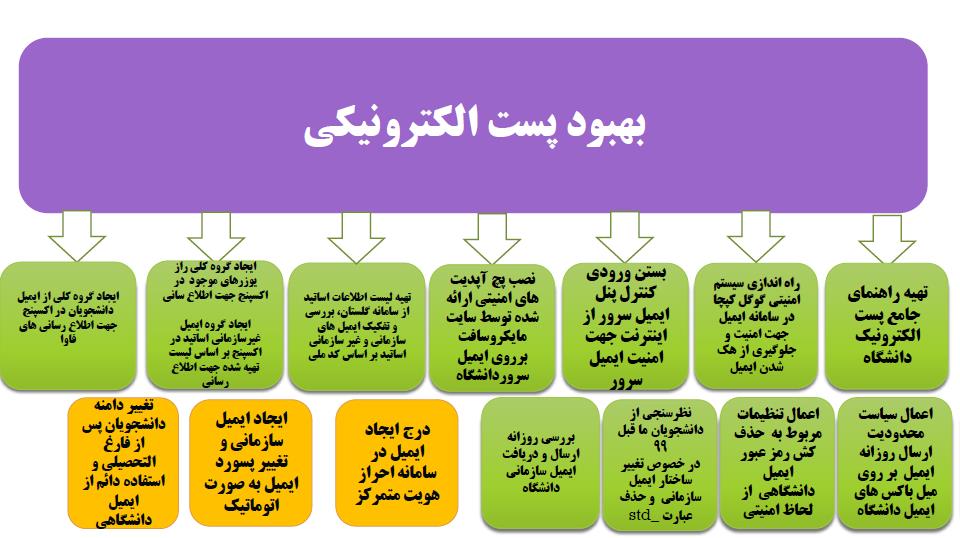 با توجه به به روزرسانی های ایمیل سرور از نظر تغییر به آخرین ورژن و بهینه سازی سخت افزار مورد استفاده، سینک اکتیودایرکتوری های موجود در کرج و تهران و همچنین با اصلاح ساختار اکتیودایرکتوری و دسته بندی و تفکیک گروه های کاربری مرکز فاوا در یک قالب ساخت یافته خدمات بیشتری را حهت افزایش تعداد و تنوع کاربران و رفع مشکلات گذشته ارائه نموده است.