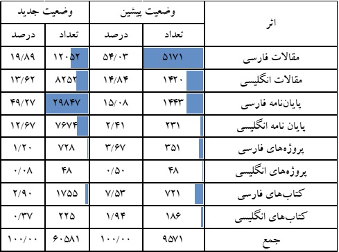 مشاهده اطلاعات جدول ۱ و نمودار ۷ نشان میدهد که بیشترین تغییر در پایاننامههای فارسی و انگلیسی و مقالات انگلیسی و فارسی است. بیشترین آثار در وضعیت موجود مربوط میشود به مقالات فارسی اما پس از واکشی، اطلاعات پایاننامههای فارسی بیشترین تعداد را شامل میشوند و پس از آن مقالات فارسی در رتبه دوم قرار دارند.