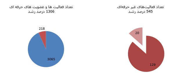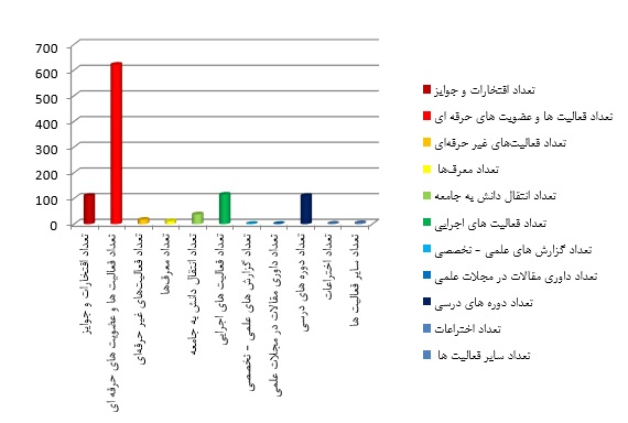 همانطور که در نمودارهای ۹ الی ۱۱ قابل مشاهده است در بخش پایان نامه های انگلیسی رشد ۳۳۰۰ درصد در بخش مقالات علمی انگلیسی ۴۸۲ درصد رشد، در بخش مقالات ارائه شده انگلیسی ۶۲۴ درصد رشد در بخش فعالیت ها و عضویت های حرفه ای انگلیسی ۸۴۱ درصد رشد بدست آمده است.