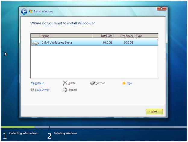 اگر هاردیسک شما قبلا دارای ویندوز XP یا هر ویندوز دیگری باشد کافیست درایوی که ویندوز بر روی آن نصب است را انتخاب بر روی گزینه Load Drive کلیک کرده و از گزینه هایی که در اختیار شما قرار می گیرد گزینه Format را زده و بعد از آن بر روی کلید Next کلیک کنید .